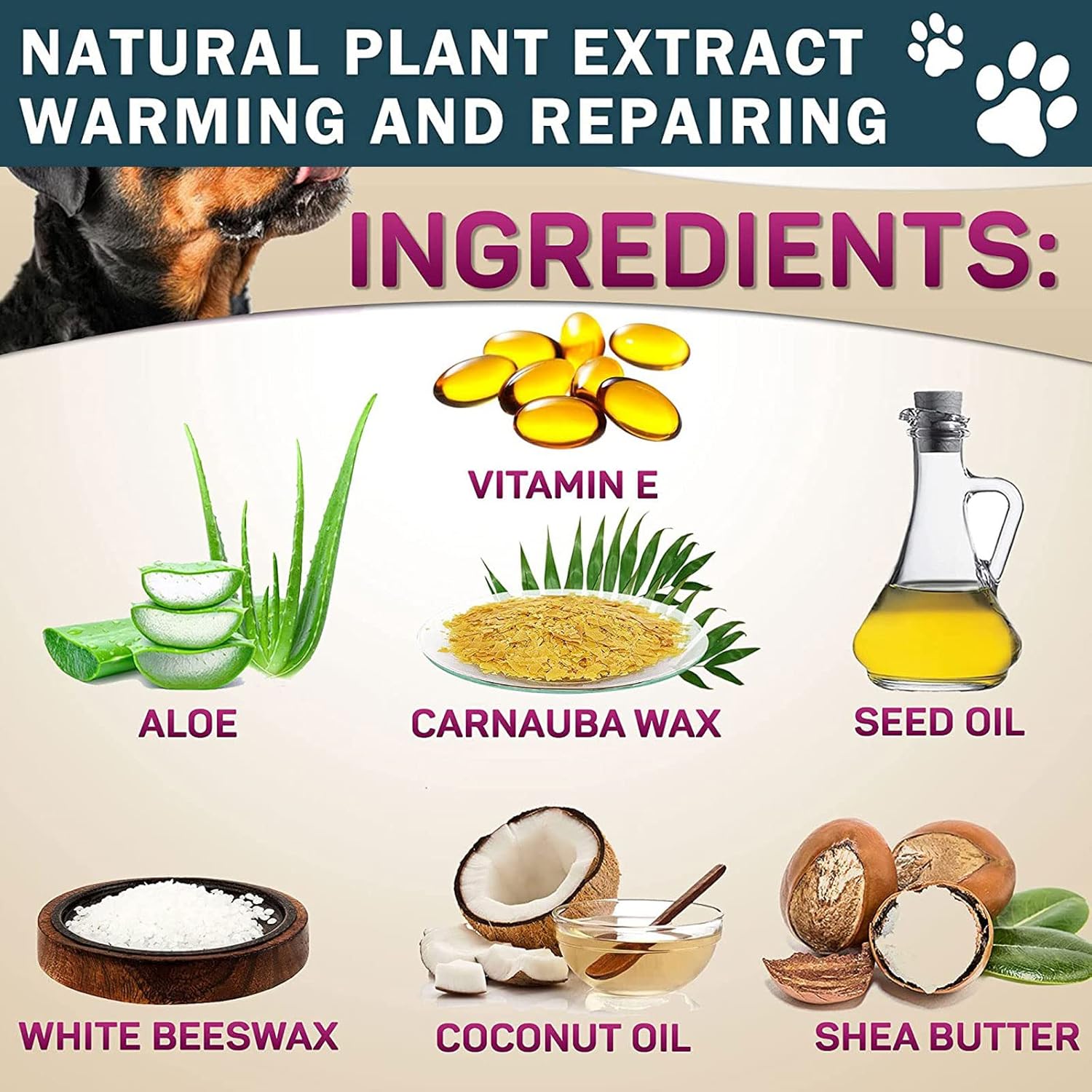【Paw Balm Moisturizing And Moisturizing】- Our Paw Balm contains pure natural moisturizing waxes not present in most dog paw protection balms. An ideal way to protect against extreme weather conditions, treating and healing scars, wounds, paw allergies, dry elbows, & more. Ideal for Extreme Weather Season Conditions
