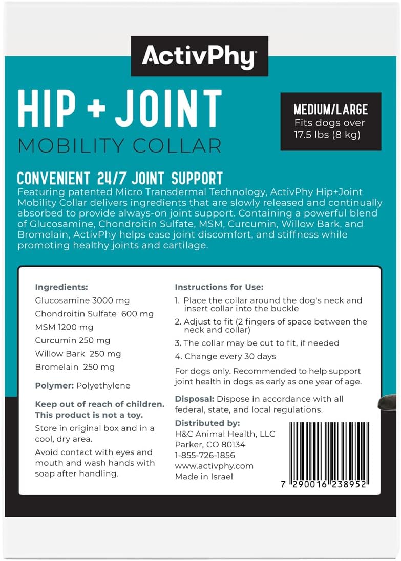 TRANSDERMAL DELIVERY: Featuring patented Micro Transdermal Technology, ActivPhy Hip + Joint Mobility Collar releases active ingredients that are slowly and continually absorbed by your dog. Say goodbye to daily chews.