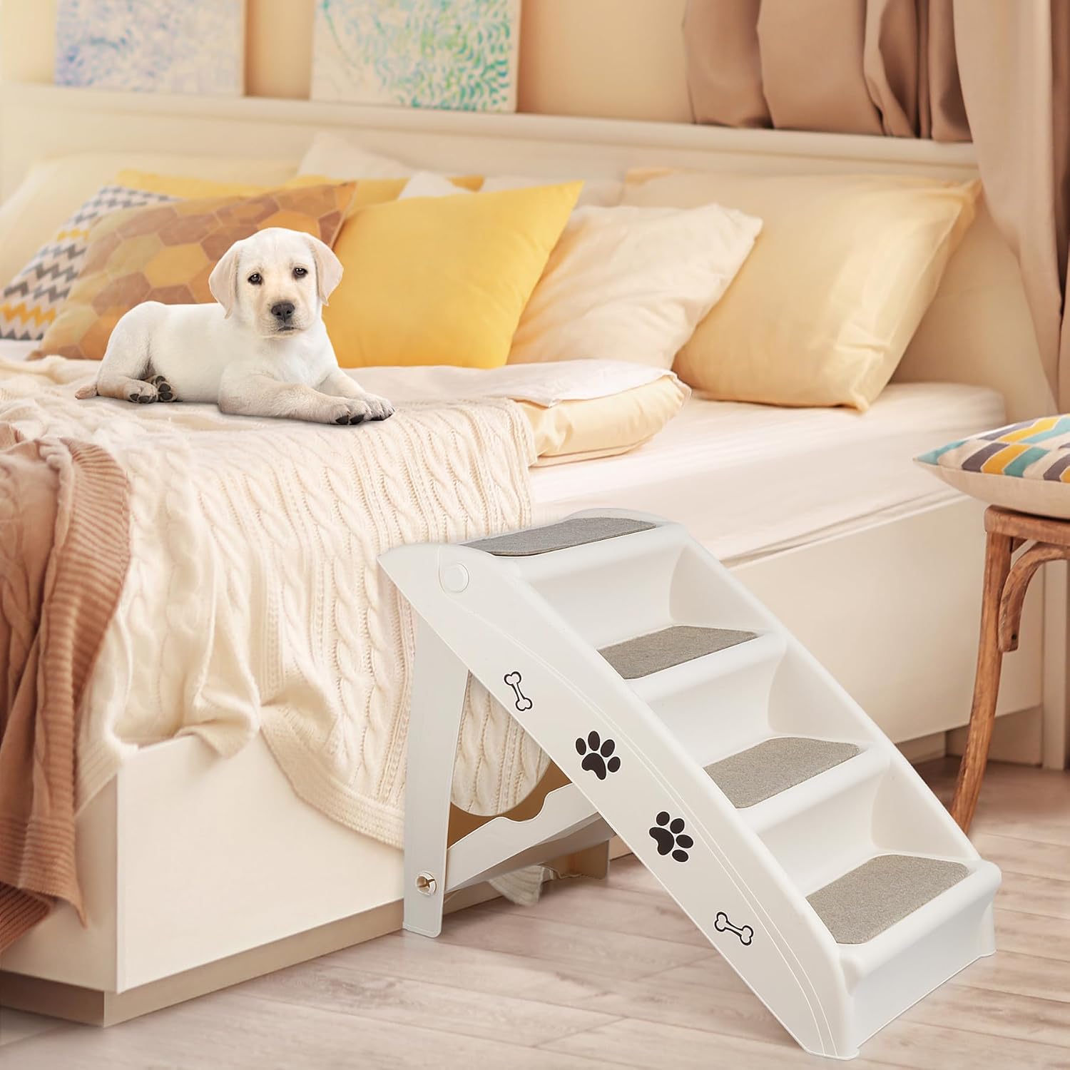 【Ideal for Small/Older Pets】 The 4-step dog stairs design will help the pets put less stress on their joints,perfect to get them up to the couch or car easily.The doggie stair’s step size and spacing are great especially for the smaller or older dogs,and the ones who suffer from joint pain.