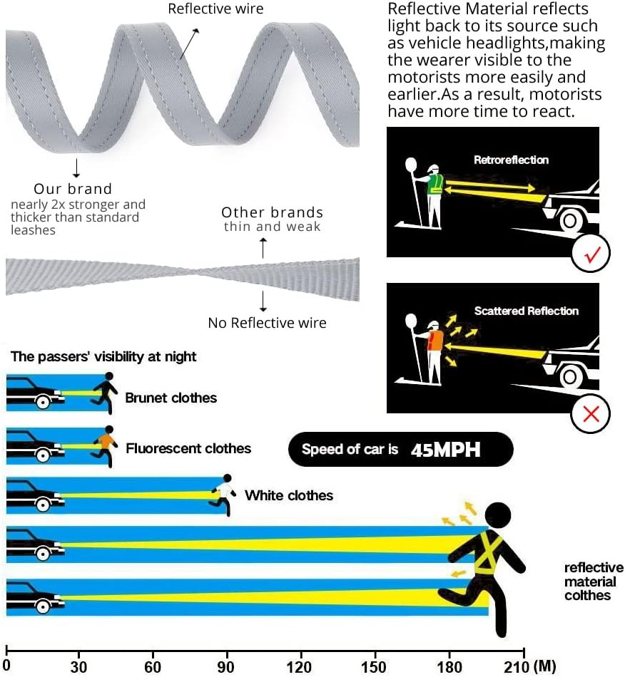Double-Sided Reflective for safety at night. The reflective stitching on both sides of the webbing can improve the visibility in the dark, thus ensuring the safety of your furry freind during night walk or jogging.