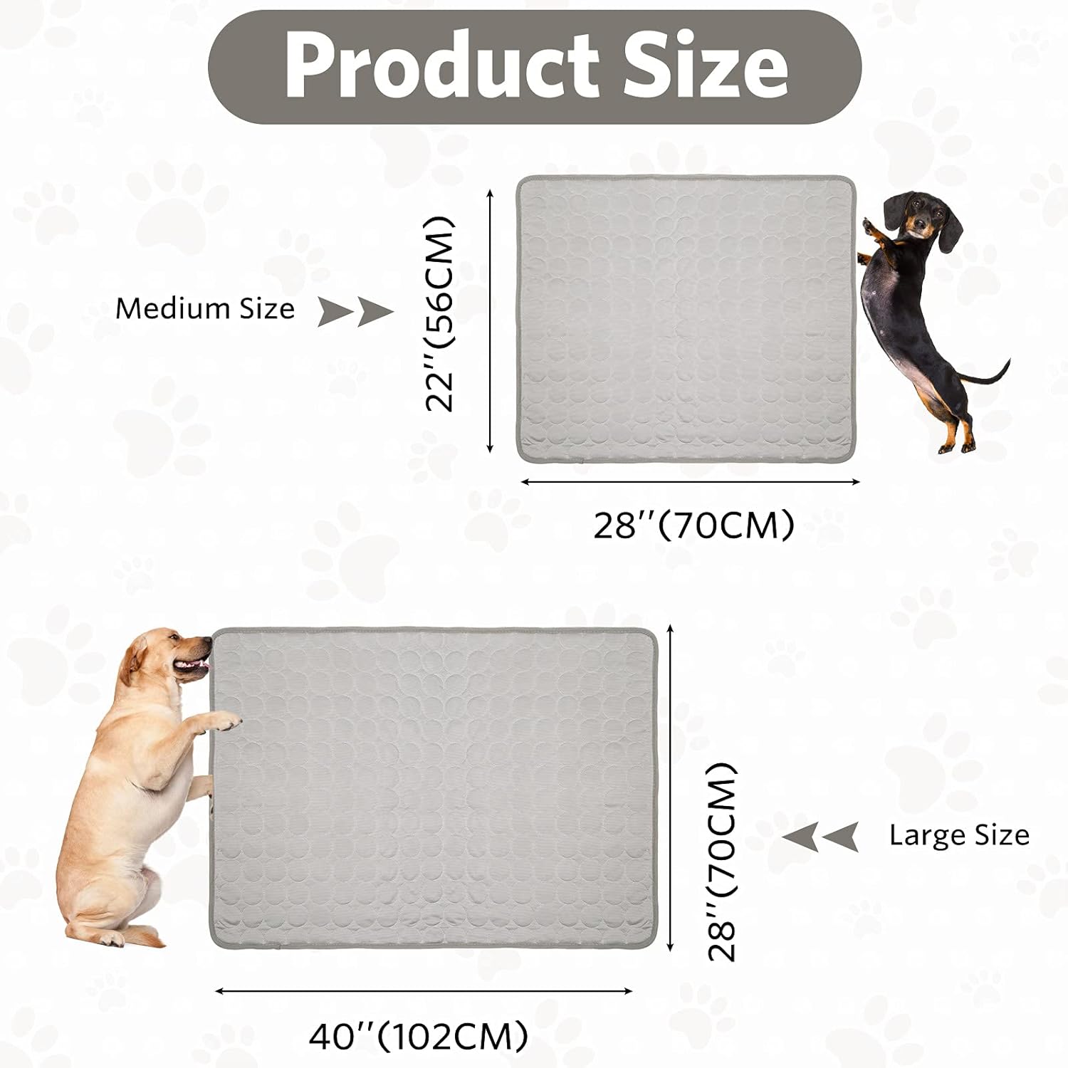 Several sizes of large dog cooling pad and small dog cooling mats available: 28×40”/70x100cm for large dogs and 28×22”/70x55cm for small pets. Other sizes are available as well. Do not leave the dog cooling mat in direct sunlight as this will affect the performance of the dog cooling pad