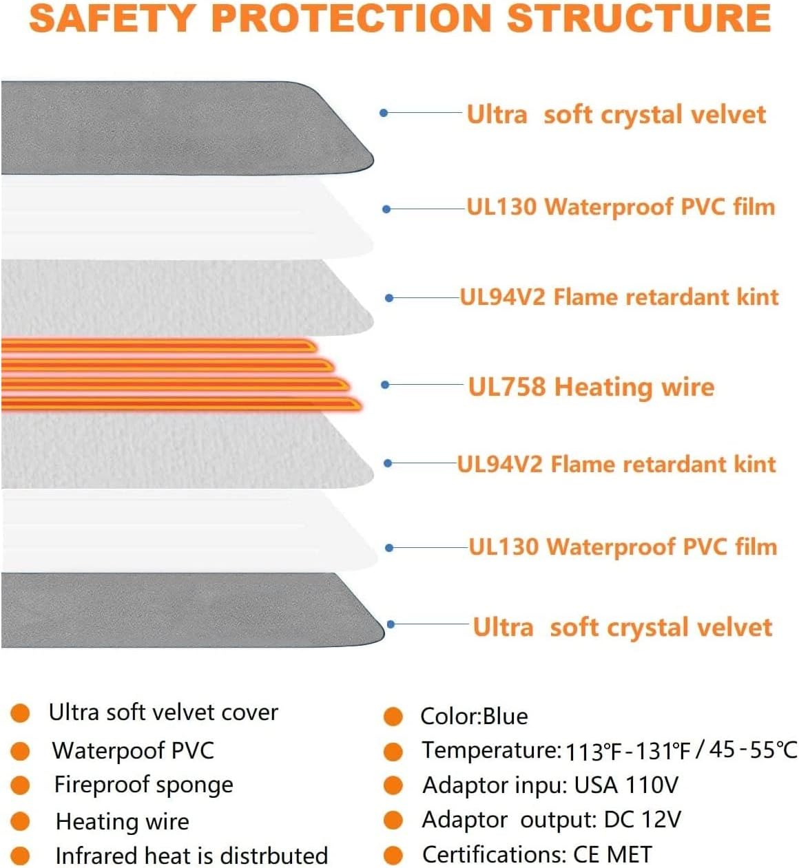 Durable and PVC fireproof material for long- lasting, the fire retardant rating of V-0 effectively prevents the heating pad from burning due to accidental leakage