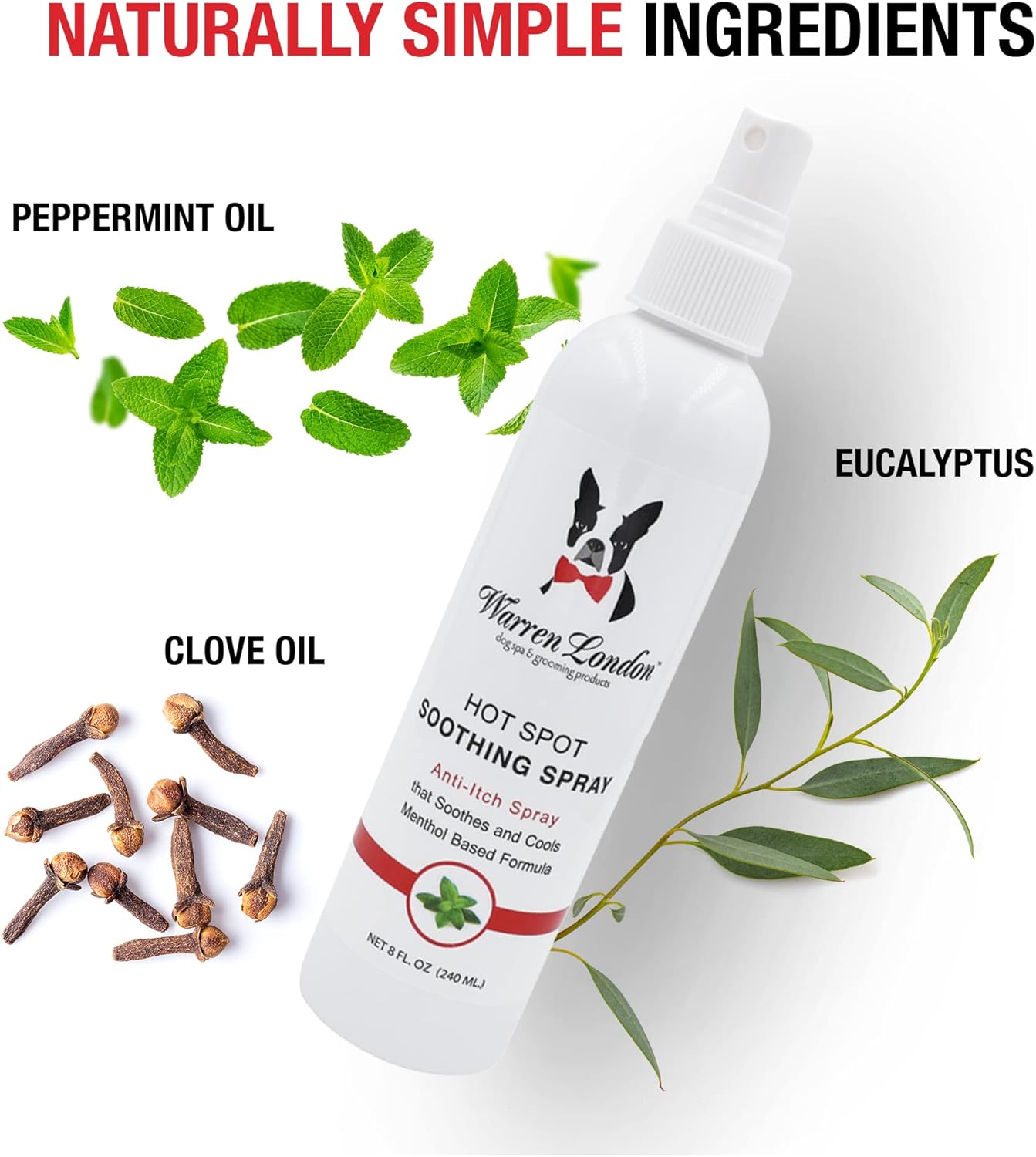Naturally Cleans & Soothes Hot Spot Irritation – The blend of Botanical Ingredients and Natural Essential Oils restore skin to address the redness & irritation that causes itching, chewing, and gnawing. Infused with Menthol, Clove Oil, Eucalyptus, and Peppermint.