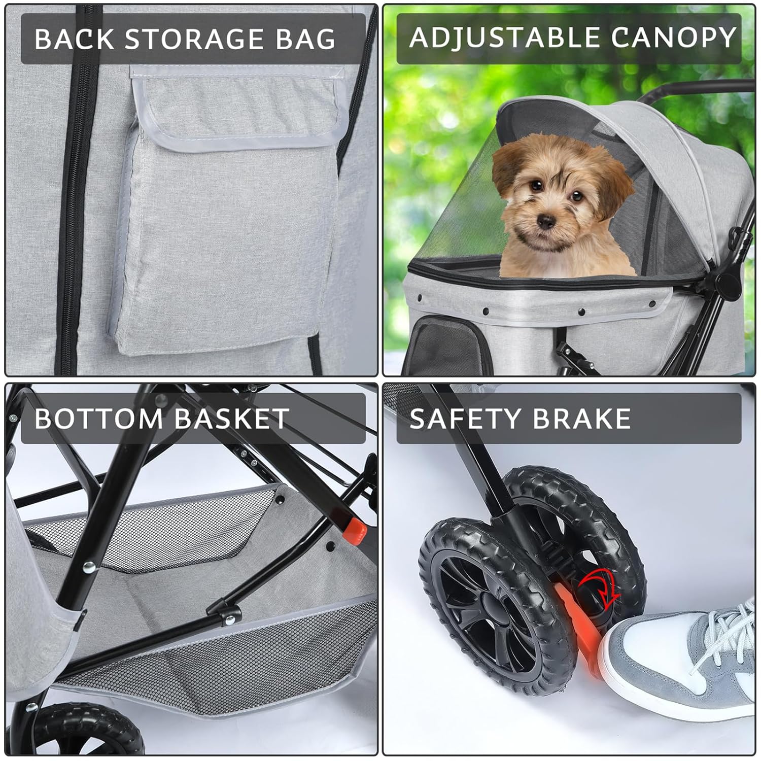 🐶 Safety and Control: There are 2 interior safety leashes to prevent your dogs from jumping out. The intuitive foot brake at the rear wheel quickly locks the stroller in place.