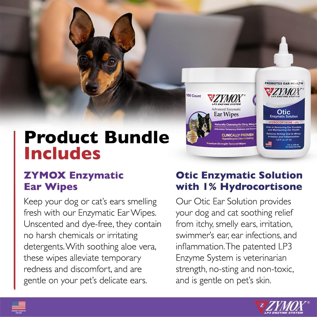 Zymox Enzymatic Ear Wipes and Otic Ear Solution for Dogs and Cats – Product Bundle – for Dirty, Waxy, Smelly Ears and to Soothe Ear Infections, 100 Count Wipes and 8oz Bottle